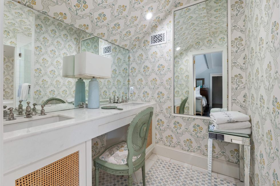 Each bedroom has its own distinctive flair, and the bathrooms are dressed in designer wallpaper and curated fixtures. The primary suite is a true retreat, with paneled walls and bespoke drapery. Throughout the home, layered textures and historical references create an elevated sense of place.