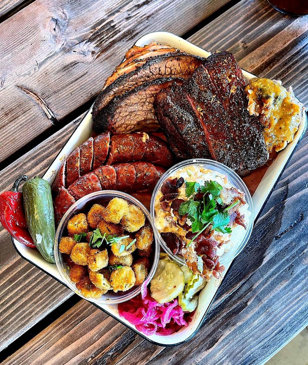 Those shopping at the Blue Hills Food Truck Alley can expect a feast of options. The checklist includes Dapper Bear Seafood, Tumbleweed Food Company, Vela Farms, and Wildflyer Mead Co. The Ellis Motel Bar pop-up serves up beer, wine, and cocktails on the patio — the spicy margarita, the Bloody Mary, and espresso martini are winners. Neon Moon Coffee brews up specialty coffee and baked goods all day on the patio. Methodist Men BBQ is open from 11 am to 3 pm on the patio — but the meats go fast.